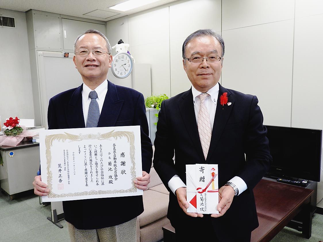 【奈良】奈良県自動車販売店協会(菊池攻会長)は11月26日、社会貢献活動の一環として奈良県福祉協議会(会長=荒井正吾知事)に浄財61万6千円を寄贈した。1975年から続く同協議会への寄贈総額は約1860万円となった。同日、菊池会長が県庁(...