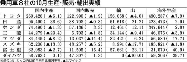 乗用車メーカー8社の10月の生産・輸出実績が出揃った。8社合計の世界生産台数は、海外生産が好調な一方、国内生産の低迷を受けて前年同月比0・8%減の238万3852台で微減となった。過去最高の海外生産を記録するメーカーが相次いだ一方で、トヨ...