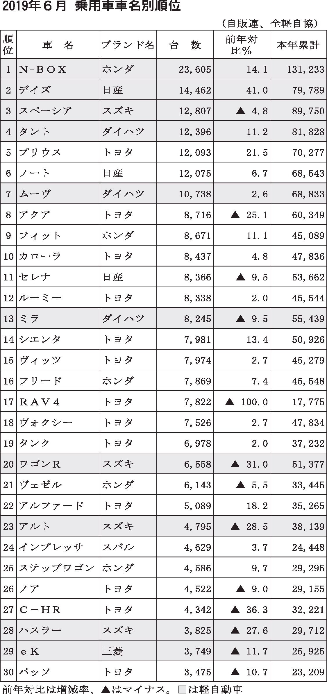2019年6月 乗用車車名別順位
