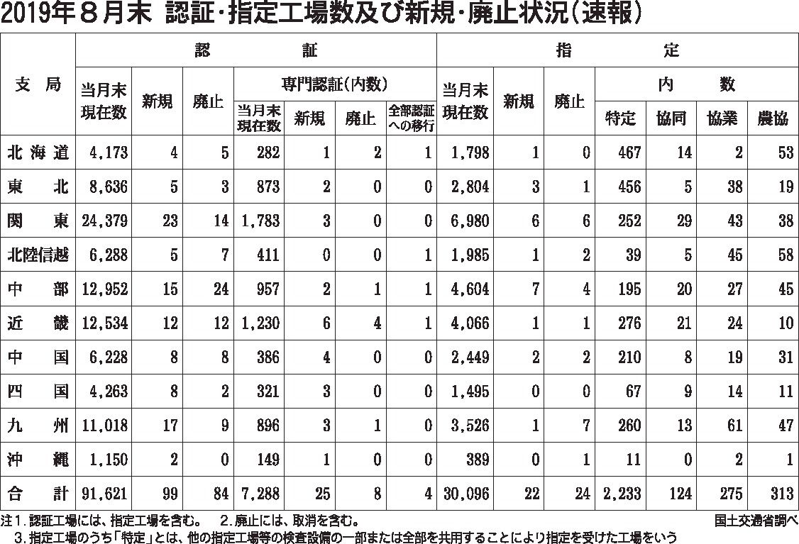 国土交通省は2019年8月末時点の認証・指定工場数及び新規・廃止の状況をまとめた。認証工場は前月比15件増加の9万1621工場で、指定工場は同2件減少の3万96工場だった。専門認証工場は同13件増加して7288工場だった。 前年同月比では...