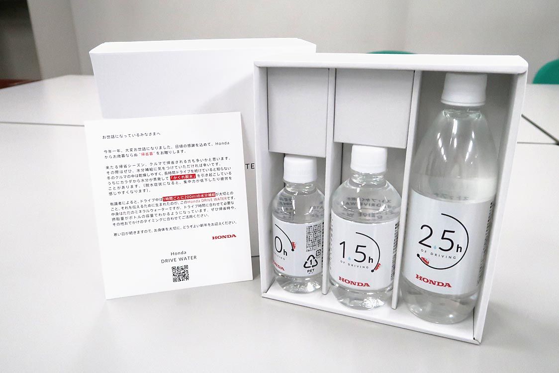 帰省中は「かくれ脱水」にご注意を―。ホンダは、冬の帰省で増加する車内での脱水を注意喚起するために「ホンダドライブウォーター」を制作した=写真。運転時間に合わせて必要な水分摂取量がひと目で分かるデザインをあしらった。 ホンダによると冬の車内...