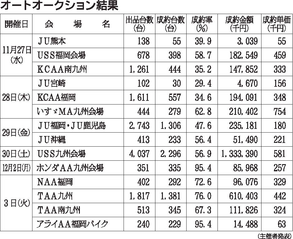 〈オートオークション結果〉九州地区 2025/11/3~11