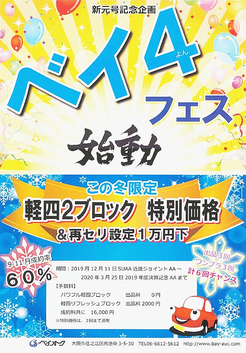 中古車オークション(AA)のベイオーク(塩原淳平社長、大阪市住之江区)は11日のAAから新元号記念企画「ベイ4(よん)フェス」を実施する。2020年3月末のAAまで軽自動車の2ブロック限定で、手数料を値下げし、再競り設定の価格も1万円下か...