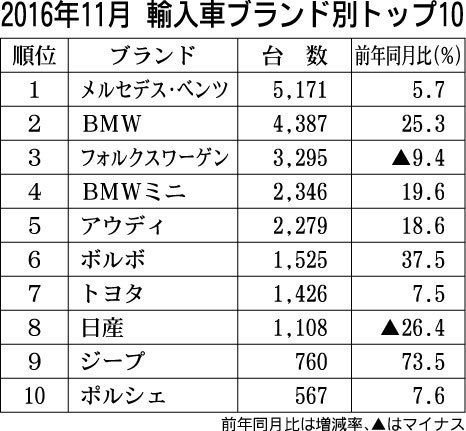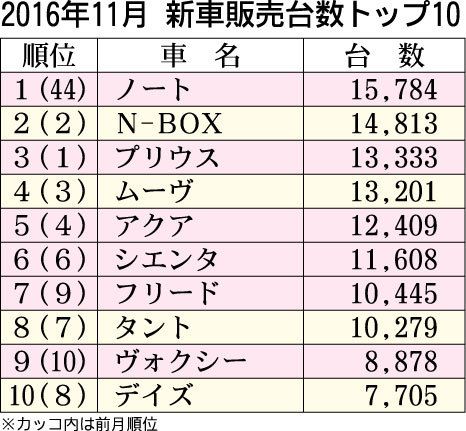 11月の新車販売の車名別順位(軽自動車含む)は、日産「ノート」がトヨタ「プリウス」とホンダ「N―BOX」を下し、初の総合首位を獲得した。11月に追加したシリーズハイブリッド車(HV)が販売を大幅に押し上げ、前年同月に対して2・4倍の1万5...