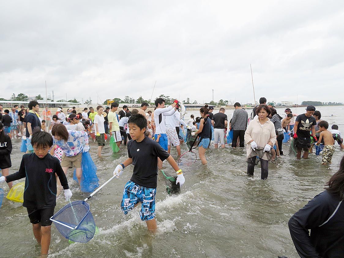 ○…魚はどこだ―大人、子供が海の中で網を持って歩き回るのは、三重県中古自動車販売協会(JU三重、奥村悦二会長)が7月21日、津市の南御殿場海岸で開催した「JU三重レクレーション大会」でのひとコマ。2年ぶりの開催となった今年は、JU三重の協...