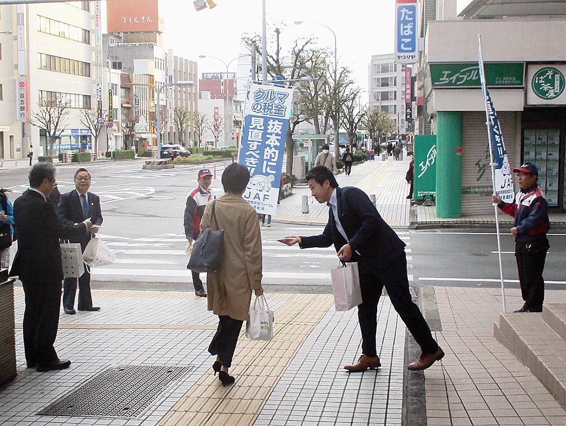 【津】日本自動車連盟(JAF)三重支部(川喜田久支部長)をはじめ自動車関連団体は11月14日、JR津駅前で自動車税制の見直しを訴える街頭活動を行った=写真。自動車税制改革フォーラムの活動の一環で、各団体の職員9人が同駅を利用する通勤客に自...