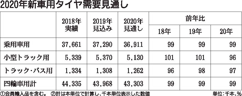 日本自動車タイヤ協会(JATMA)が12日発表した2020年の国内新車用タイヤ需要見通しは、19年見込み比1・5%減の4330万3千本となった。自動車生産台数の見通しが同1・1%減となることなどが影響する。新車用タイヤは3年連続で前年を下...