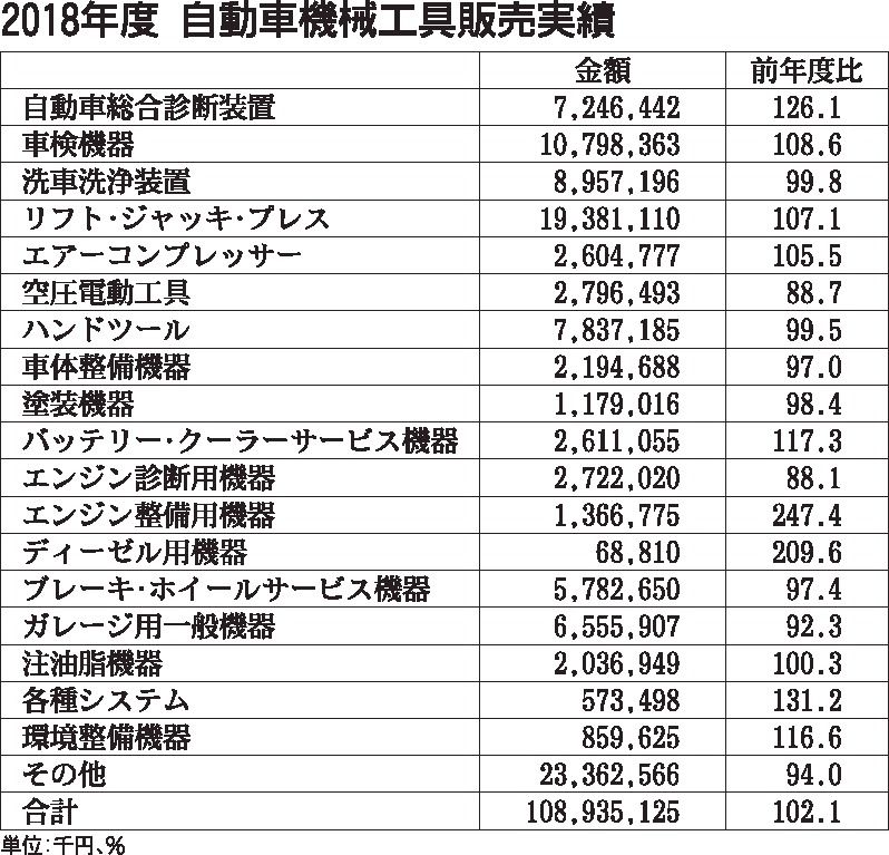 自動車整備機械工具の売り上げが順調に伸びている。日本自動車機械工具協会(機工協、柳田昌宏会長)がまとめた2018年度「自動車機械工具販売実績」によると、会員29社の機械工具販売における総売り上げは前年度比2・1%増の1089億円だった。1...
