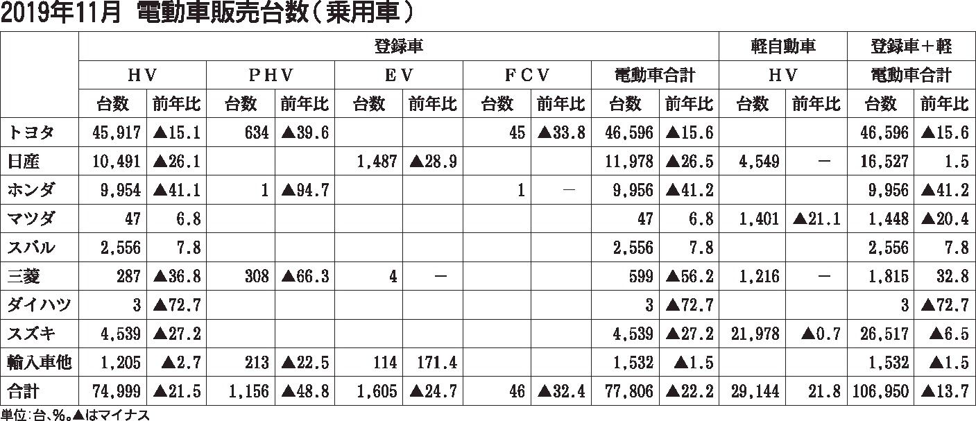 登録車と軽自動車を合わせた11月の電動車販売は、前年同月比13・7%減の10万6950台となった。2カ月連続のマイナスとなったが、台風の影響や消費税増税後の買え控えの影響で大幅減となった10月よりはマイナス幅を縮めた。乗用車に占める電動車...