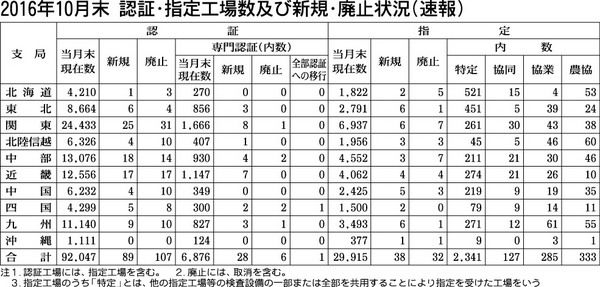 国土交通省は2016年10月末時点の認証・指定工場数および新規・廃止状況をまとめた。認証工場は前月比19件減の9万2047工場で、2カ月連続で減少した。指定工場数は6件増の2万9915件となり、5カ月連続増。専門認証工場数も21件増の68...