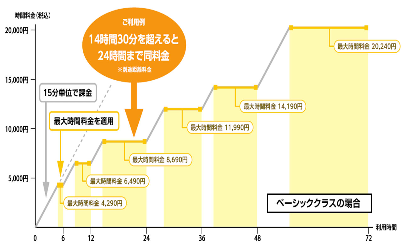 新たに設定する料金体系では、車両クラスを「3分類」、利用時間に応じた「最大時間料金制」を採用する。従来のカーシェアと異なり、長時間の利用が可能となることから、「時間料金+距離料金」を基本とするが、6時間未満の利用では距離料金を無料とする。給油・洗車に協力した際の料金サービスは30分とする。