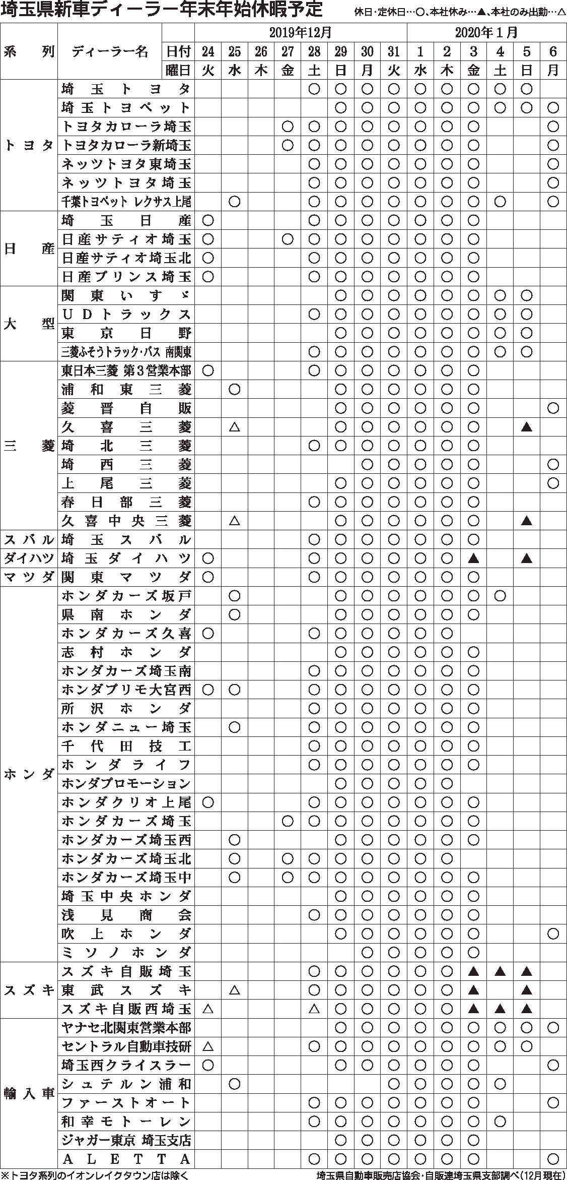 〈新車ディーラー年末年始休暇予定〉埼玉県