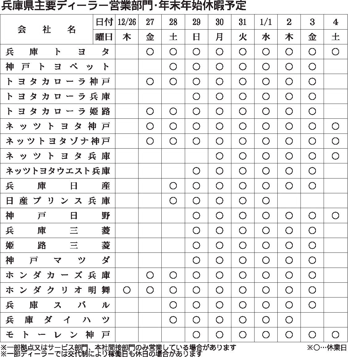 兵庫県主要ディーラー営業部門・年末年始休暇予定
