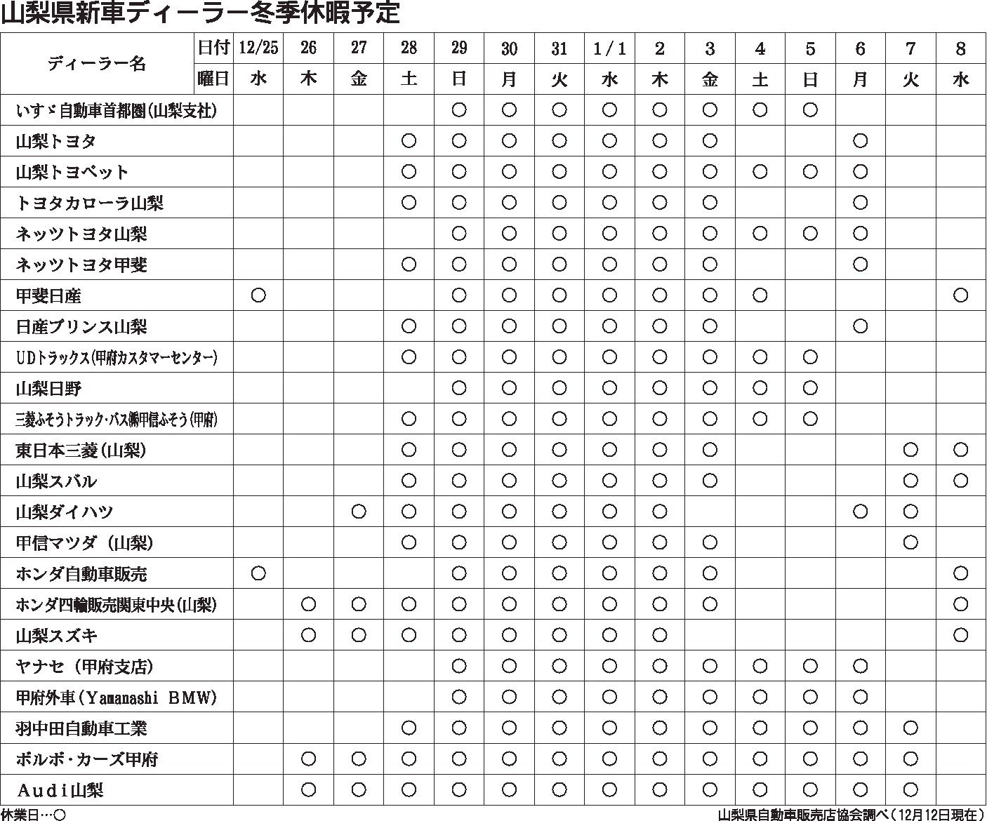 山梨県新車ディーラー冬季休暇予定
