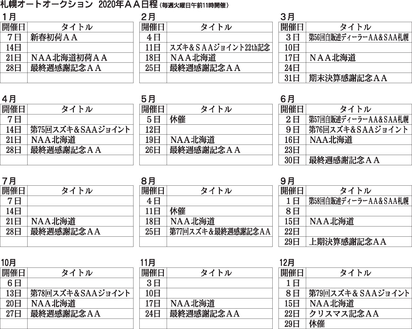 札幌オートオークション(SAA、土谷州治社長)の2020年オークション開催日程が決まった。全49開催を計画。SAA単独記念AAのほか、スズキディーラーや自販連札幌支部などとの合同AAも引き続き開催する。 単独記念AAは「新春初荷AA」(1...