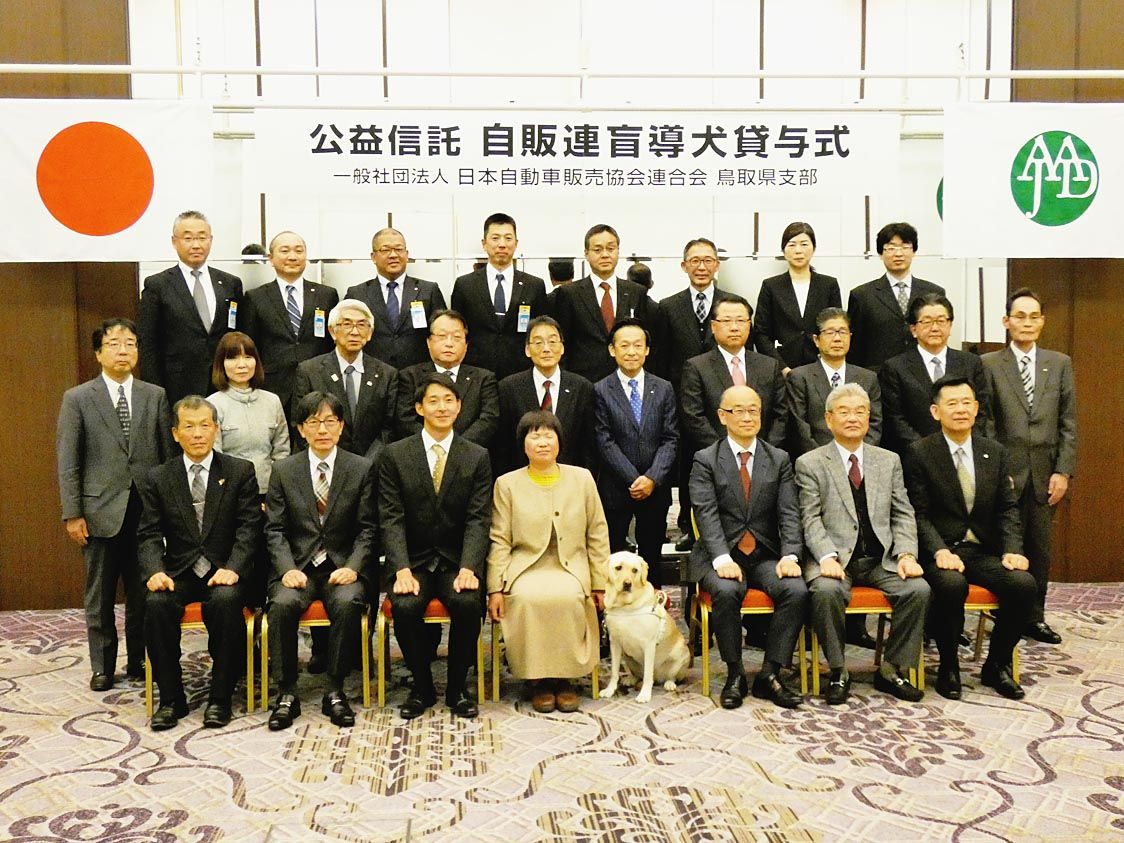 【鳥取】日本自動車販売協会連合会鳥取県支部(米原良支部長)は12日、米子市内のホテルで公益信託自販連盲導犬育成基金による「盲導犬貸与式」を実施した=写真。米原支部長、盲導犬被貸与者で米子市在住の田渕ひとみさんらが出席した。 今回貸与し盲導...