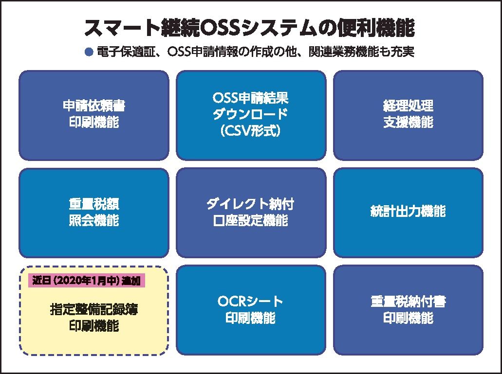 OSSに関する政府方針では、2021年度までに継続検査のうち70%をOSS申請とすることを目指している。こうした指針を実現するべく自検協では「スマート継続」の利用促進を進めている。「スマート継続」により「簡便」「迅速」「正確」な保適証とOSS申請依頼情報の作成が可能となり、自動車販売店や専業指定整備工場といった導入側では一層の業務効率化、業務精度向上によるミスの低減はもちろん、従業員の負担軽減による働き方改革にもつながると大きな期待が寄せられている。