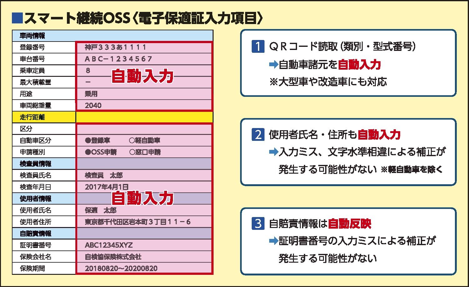 スマート継続は、指定整備工場が電子保適証とOSS申請依頼情報を作成することを基本としたシステム。専用ソフトなどを必要とせず車検証のQRコードを読み取るだけで電子保適証のほとんど全て(走行距離のみハンド入力)が完成する。登録車と届出車どちらの電子保適証の作成にも対応するほか、ハイブリッド申請用電子保適証の作成にも対応している。作成した電子保適証は登録情報処理機関の保適証サービスに、OSS申請依頼情報はOSS申請共同利用システム(AINAS)にそれぞれ送信される。スマート継続を利用することで指定整備工場における検査員の業務効率化が図れるようハンド入力を極力排除し、正確かつ効率的に電子保適証とOSS申請依頼情報が作成できる仕組みだ。