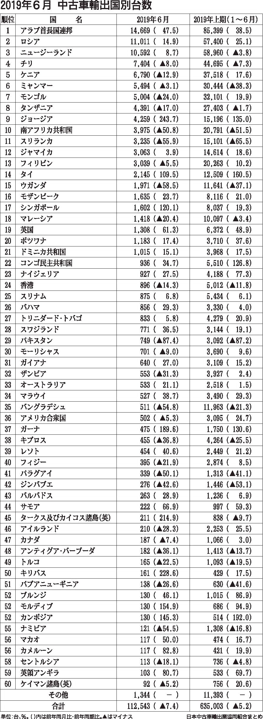 日本中古車輸出業協同組合(佐藤博理事長)がまとめた2019年6月の国別中古車輸出台数は、前年同月比7・4%減の11万2543台となり、4カ月連続でマイナスだった。アラブ首長国連邦(UAE)、ロシア、ニュージーランドの上位3カ国は、プラス実...