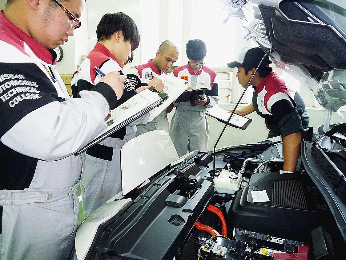 日産愛知自動車大学校(松川健一校長)は7月25日、名古屋市港区の同校で「リーフ」や新型車を使用した特別授業を実施した=写真。日産自動車社員と東海・北陸の日産系販社14社が協力し、同校自動車整備科の1年生133人を対象に授業を行ったほか、一...