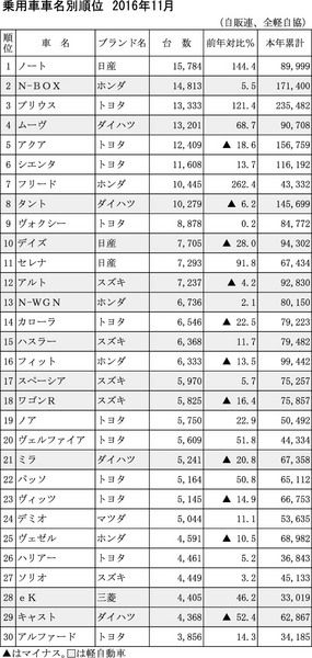 【乗用車車名別順位 2016年11月】