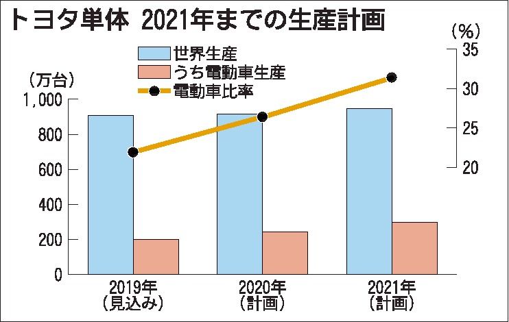 トヨタ自動車の電動車生産が加速する。今年の生産台数は199万台の見通し。ハイブリッド車(HV)を中心に来年、再来年と年率2割のペースで増え、2021年には約300万台と世界生産(単体ベース)の3割を超える。このペースが続けば25年にも60...