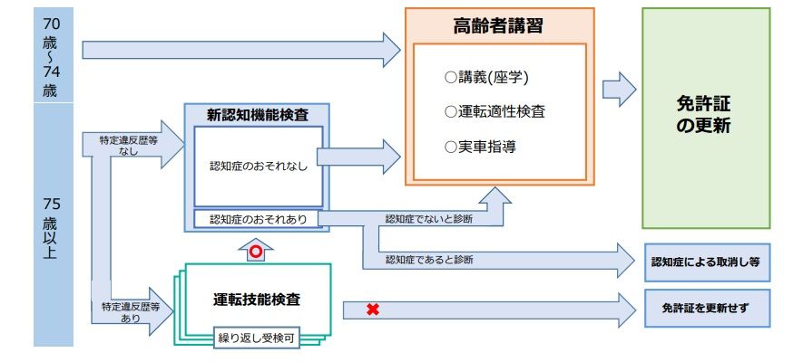 高齢者の免許更新時、自動車教習所で実車を使って運転技能を検査し、運転技能が不十分な場合、免許証の更新を認めない制度を導入する。対象は75歳以上または80歳以上で検討する。過去に事故歴のある人や、特定の違反歴がある人など、交通事故を起こすリスクの高い人に絞り込むことも視野に入れる。運転技能検査が不合格となっても、何度でも検査を受けることを可能にする。