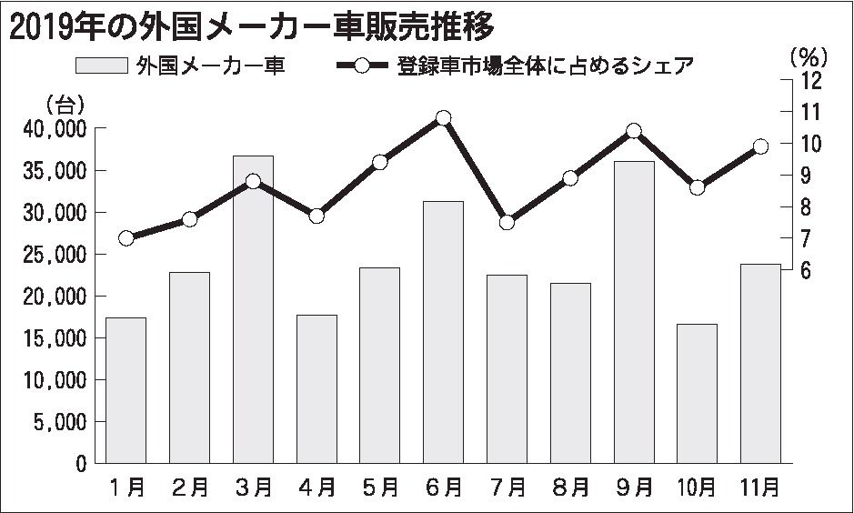 2019年の外国メーカー車の販売台数は、4年ぶりに前年割れとなる公算が高まった。今夏までは、通期での前年超えが視野に入っていた。上期(1~6月)は10年ぶりのマイナスだったが、今年後半の活発な新型車投入による巻き返しを見込んでいたためだ。...