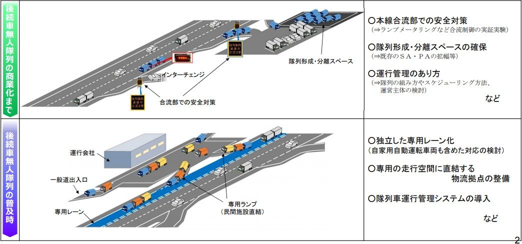 また、後続車無人隊列走行システムの普及期は、3車線区間の右側レーンの専用レーン化を検討する。中国道など、並行路線も含めて機能分担による専用空間の確保も検討する。物流拠点と専用走行空間との直結ランプの整備を検討する。