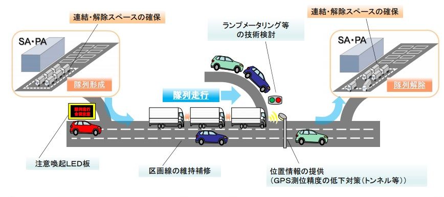 それによると2022年度以降を想定している後続車が無人の隊列走行システムを商業化するまでは、左側レーンを隊列車両の走行車線とすることを念頭に置き、ITS技術を活用して安全で円滑な合流方法を確保する。既存のSA・PA(サービスエリア・パーキングエリア)の拡幅して隊列形成・分離スペースを整備する。SA・PAで駐車スペースの確保や駐車場予約システムを導入する。