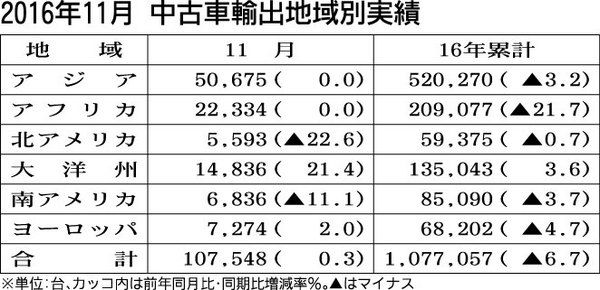 日本中古車輸出業協同組合(中輸協、佐藤博理事長)がまとめた2016年11月の中古車輸出台数は、前年同月比0・3%増の10万7548台で9カ月ぶりに前年実績を上回った。アジアやアフリカは前年並みで推移したが、大洋州が台数を引き上げ、2カ月連...