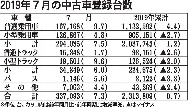 日本自動車販売協会連合会(自販連)が13日発表した2019年7月の中古車登録台数は、前年同期比7・3%増の33万7093台となり、3カ月ぶりのプラスに転じた。稼働日が1日多かったほか、新車登録が堅調に推移したことが中古車発生量の増加につな...