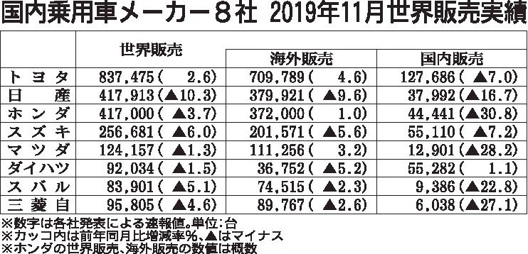 乗用車メーカー8社が25日に発表した11月の世界販売実績によると、8社合計は前年同月比2・9%減の232万4966台となり、トヨタ自動車を除く7社が前年実績を下回った。消費増税の影響などにより国内販売は2桁減となった。海外販売では米国と中...