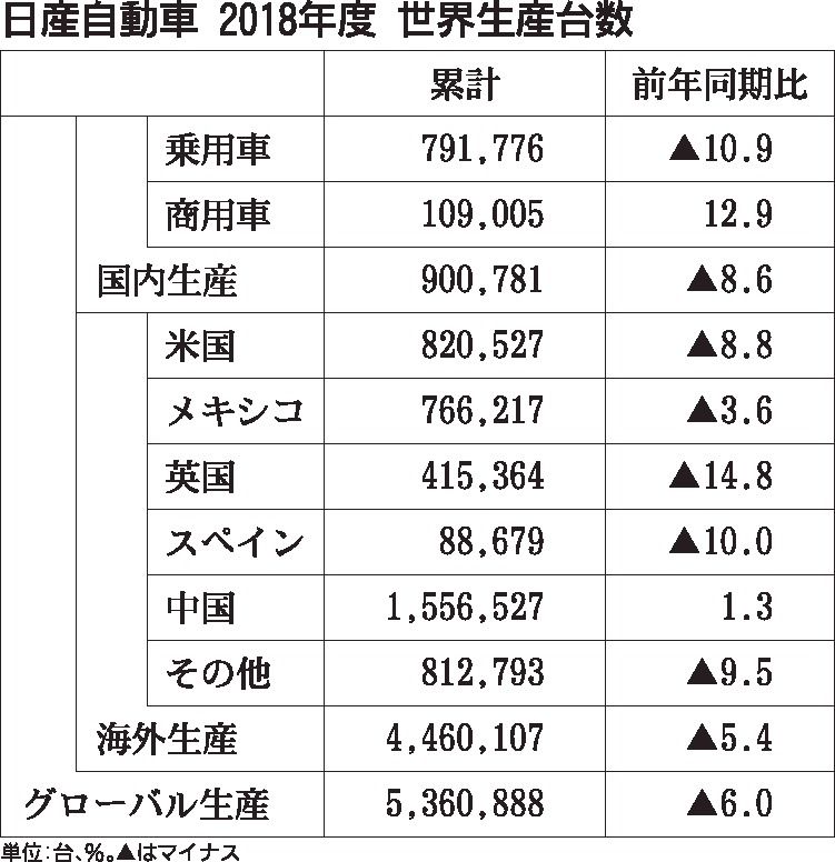 日産自動車の2018年度世界生産台数は、過去最高を更新した17年度比で6・0%減の536万888台となった。販売が好調な中国がプラスとなり過去最高を更新したものの、主力の米国や日本での生産が落ち込み、3年ぶりに前年実績を下回った。カルロス...