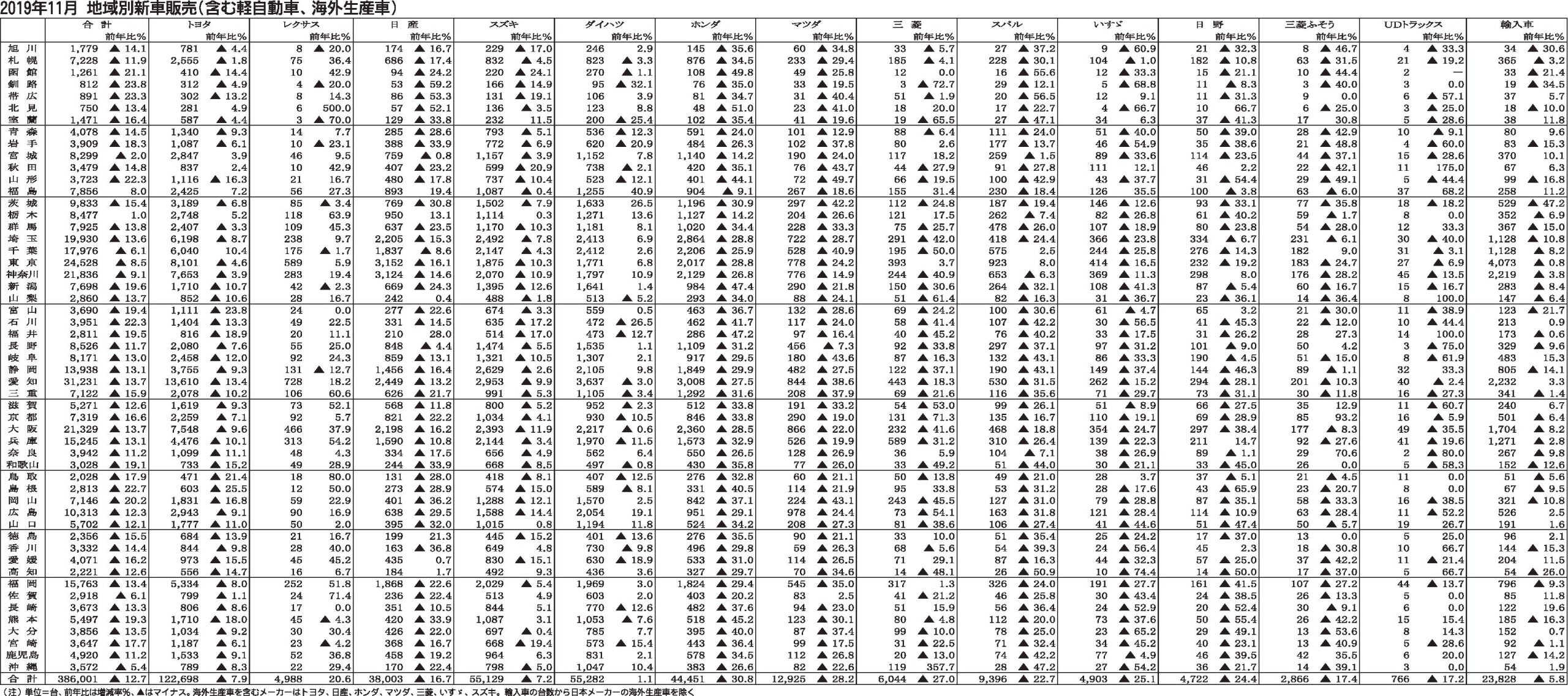 〈2019年11月 地域別新車販売(含む軽自動車、海外生産車)〉