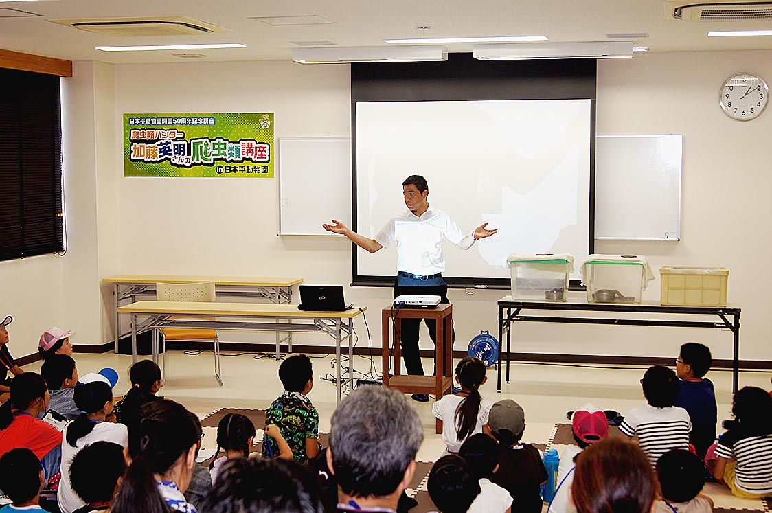 【静岡】静岡トヨタ(太田勝之社長)は4日、静岡市駿河区の静岡市立日本平動物園で爬虫類の生態などを楽しく学ぶ小学生向けイベントを開催した=写真。静岡大学教育学部講師で数多くのテレビ番組に出演している加藤英明氏を講師に招き、「爬虫類ハンター加...