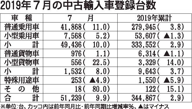 日本自動車輸入組合が13日発表した2019年7月の中古輸入車登録台数は、前年同月比9・9%増の5万1239台となり、2カ月連続で増加した。 車種別にみると、乗用車が同10・0%増、貨物車が同8・0%増とともに前年実績を大きく上回った。ブラ...