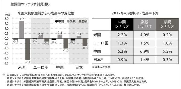 ■日本のGDP成長率予測 楽観で1.4%、悲観は0.3% 三菱総合研究所は2017年の「内外経済の展望」をまとめた。注目の米国トランプ新政権の政策運営を柱に、楽観、悲観、中間の各シナリオを予測。米国新政権の政策運営で上振れした場合の楽観シ...