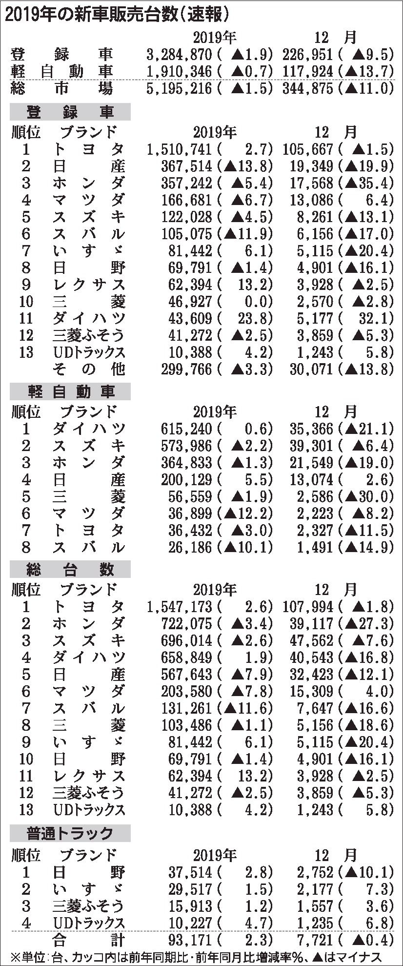 〈2019年の新車販売台数(速報)〉