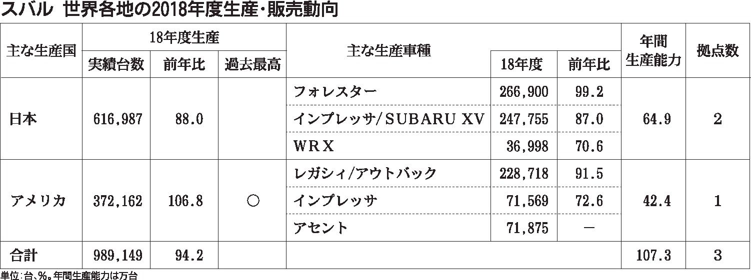 [[販売の8割強米国が占める]] スバルは世界販売の8割強を米国が占める。生産拠点は日本と米国に構えており、過去5年間の急速な販売台数の拡大にともない生産能力を増強してきた。一方、急成長の反動でひずみが生じ、完成検査問題やリコールの増加とい...