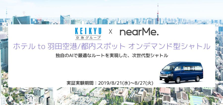 京浜急行電鉄は8月19日、NearMe(東京都千代田区、髙原幸一郎社長)が開発した配車AI(人工知能)を活用して利用者のリクエストに応じて最適ルートを9人乗りシャトルバスが相乗り運行する「スマートシャトル」の実証実験を8月21日から27日まで実施すると発表した。