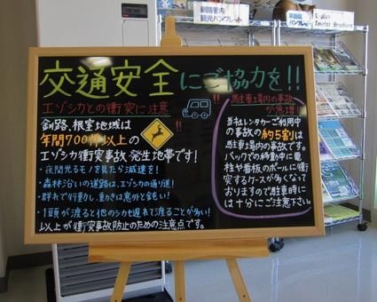 エゾシカとの衝突注意! トヨタレンタリース釧路(工藤靖雄社長)は本社・釧路店の待合室に黒板を置き、秋に多発するシカとの衝突事故防止などをレンタカーの利用者に呼びかけている。枯れ草とシカの毛の色が同じに見え、道路に飛び出したシカに気づかず事...