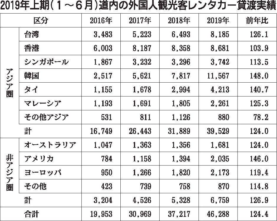 北海道地区レンタカー協会連合会(佐藤譲会長)がまとめた2019年上期(1~6月)の道内外国人観光客レンタカー貸渡実績は、4万6288件(前年同期比24・4%増)に上った。国別では韓国が利用件数、伸び率ともにトップとなった。また日本の交通事...