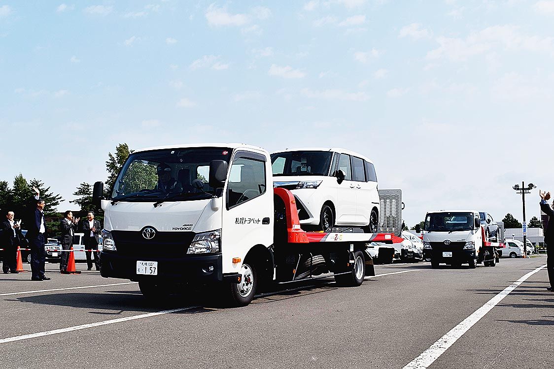 札幌トヨペット(沖田俊弥社長)は、新車搬送時の路上積み下ろし問題や陸送事業者の人手不足対策に対応し、札幌市内拠点の新車搬送を自社で行うことにした。社内に専任ドライバー3人による搬送チームを発足。新たに導入した搬送車2台の出発式を19日、本...