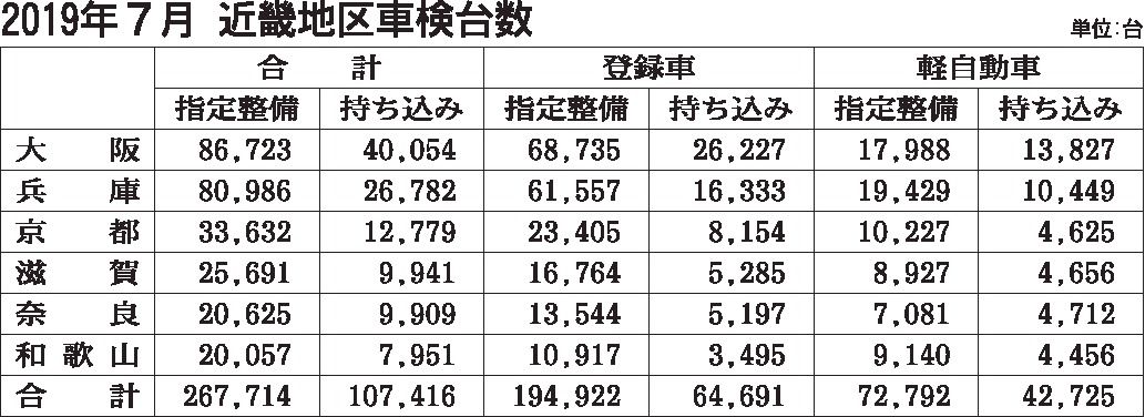 近畿地区の2019年7月の継続検査(車検)台数(軽自動車を含む)は、2カ月ぶりのプラスとなる前年同月比6・6%増の37万5130台だった。登録車が大幅伸長を示したものの、軽の落ち込みが続いた。 登録車は10・2%増の25万9613台に達し...