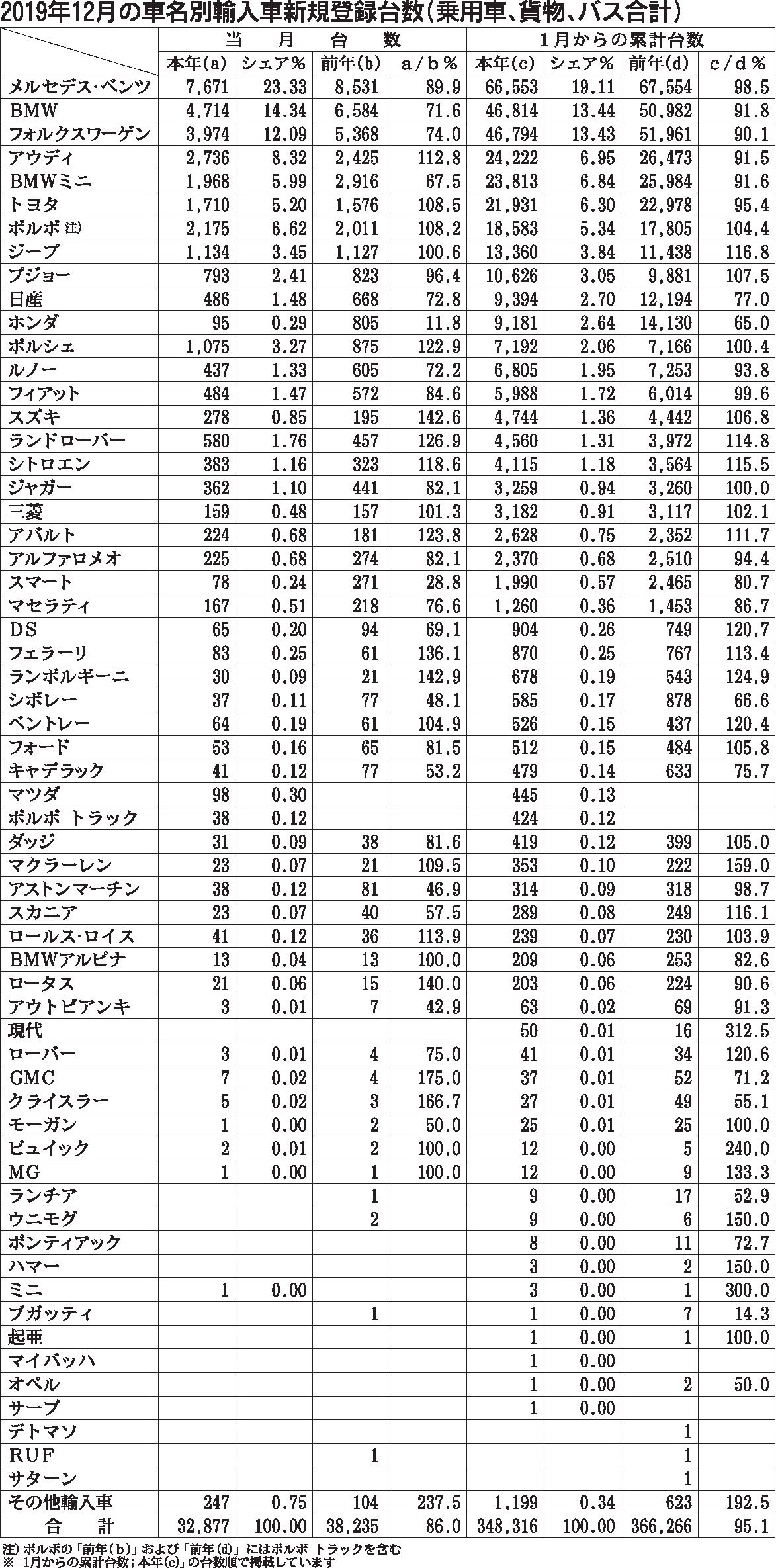 【2019年12月の車名別輸入車新規登録台数(乗用車、貨物、バス合計)】