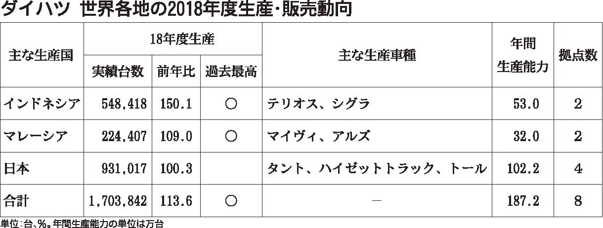 ダイハツ工業の2018年度の生産台数は、過去最高の約170万台だった。特に海外生産は、インドネシア、マレーシアともに過去最高を更新した。日本も堅調な販売に支えられ、前年を上回った。7月に発売した新型「タント」で導入開始した新プラットフォー...