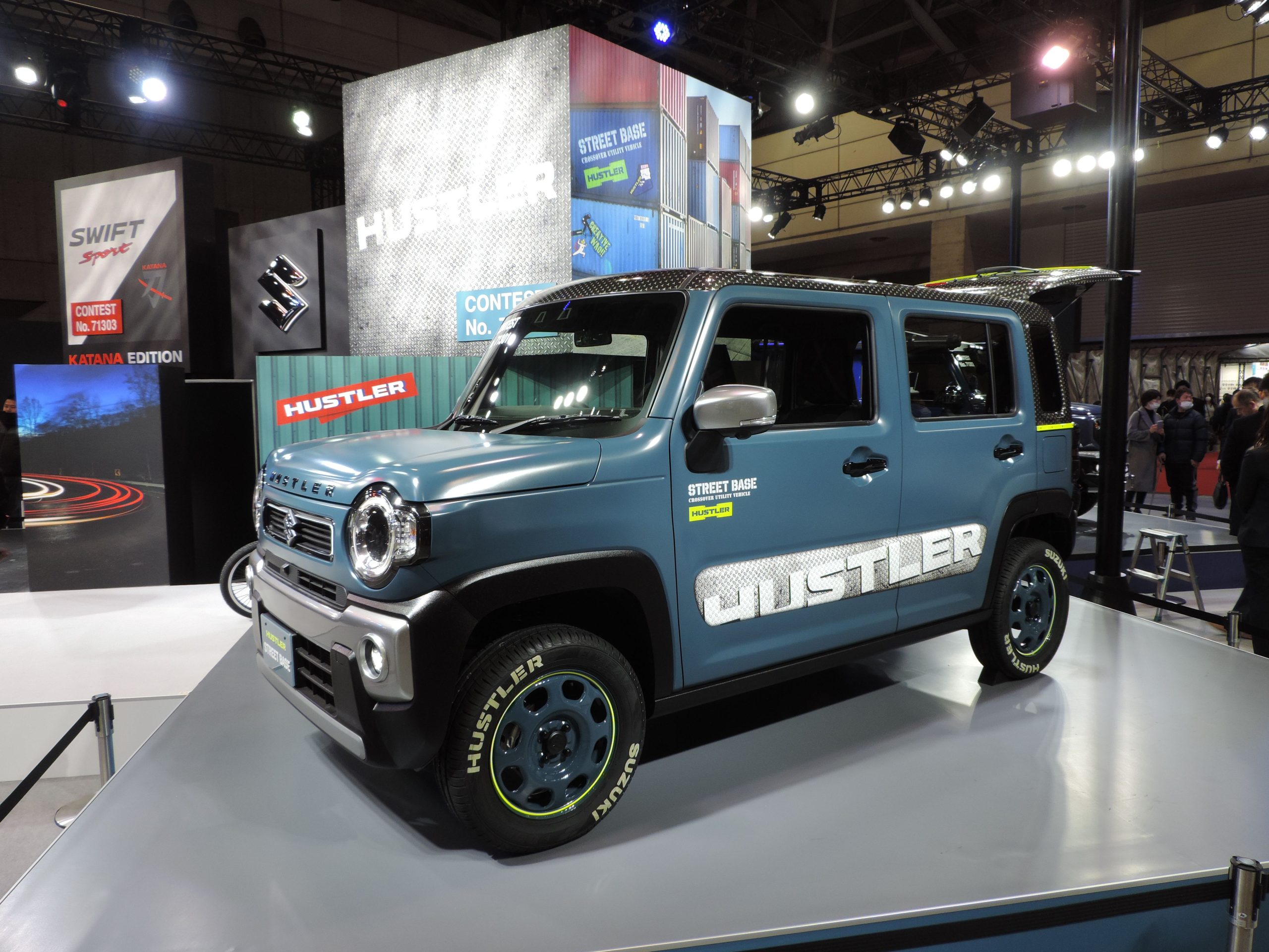スズキは1月にフルモデルチェンジして発売したばかりのハスラーのコンセプトモデルとなるストリートベースを参考出品した。ダンスやスケボーなどのストリートスポーツを楽しむ若者の基地を想定し、外装はコンテナをイメージしたマットカラーを採用、内装にはスピーカーとイルミネーションによってライブ会場のような音楽と光の世界を表現した。ジムニーをベースに、マリンレジャーをイメージしたシエラマリンスタイルや、大型二輪車のKATANAをスイフトスポーツで表現したカタナエディションも出展した。