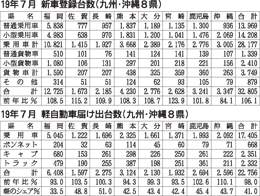 九州・沖縄地区の2019年7月の新車販売台数は前年同月比2・7%増の5万5561台となり2カ月ぶりに増加に転じた。登録車が2カ月ぶりに増加した一方で、軽自動車は4カ月ぶりに減少した。新車販売に占める軽自動車の構成比は前年同月と比較して1・...