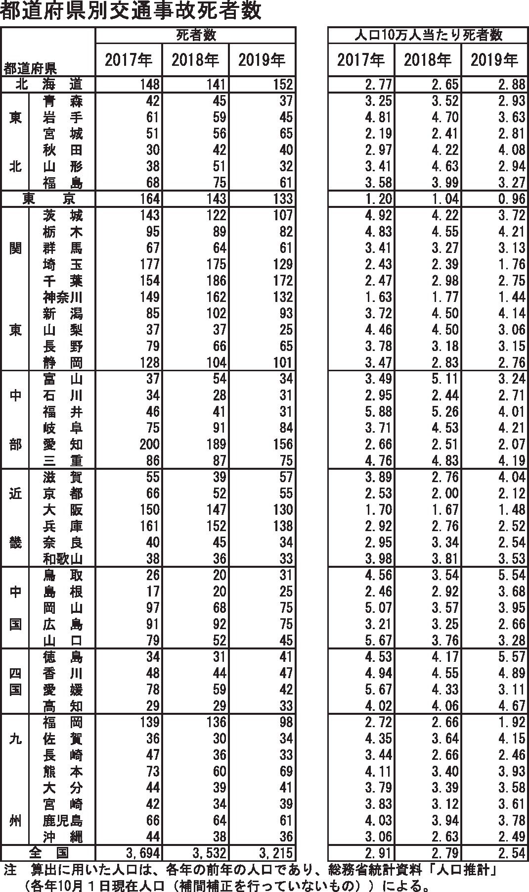 2019年に全国で発生した交通事故による死者数(24時間以内)が3年連続で最少となった。警察庁のまとめによると、19年の死者数は前年比317人減(9・0%減)の3215人だった。統計が残る1948年以降で最も少なかった。現在の統計と同条件...